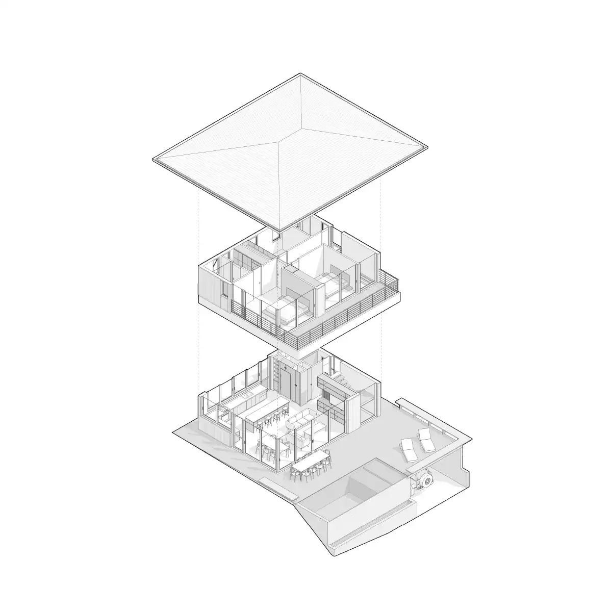 This contemporary hillside home features an elegant two-story design with expansive glass walls and large balconies, offering stunning views of the surrounding nature. Elevated on a stone foundation, it combines luxury and tranquility, creating a perfect modern retreat in the heart of the jungle.